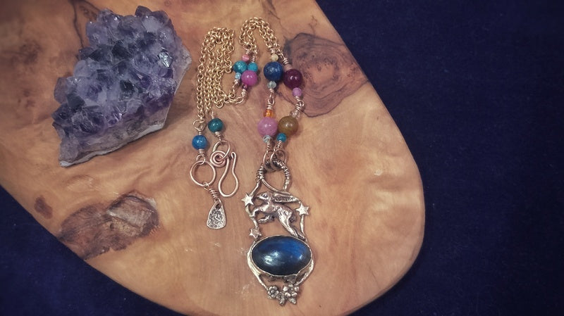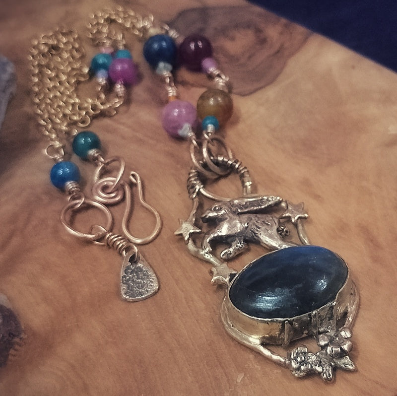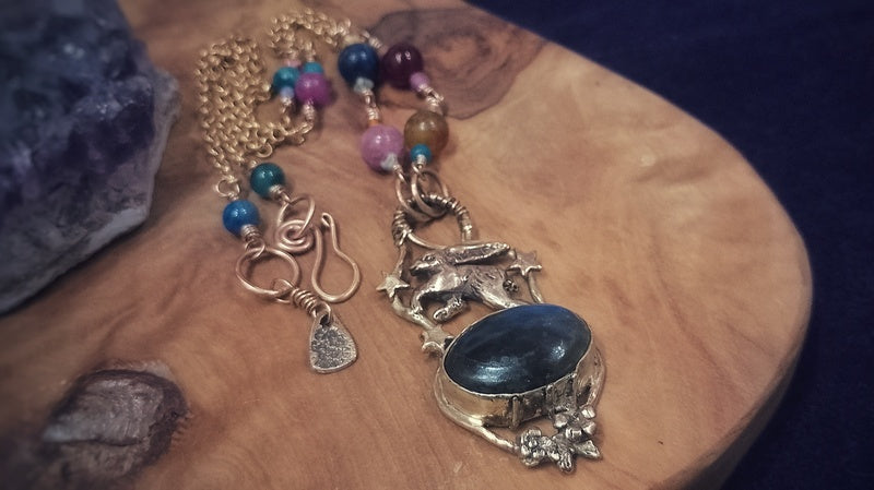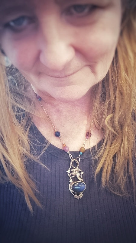 Materials: Bronze with beautiful labradorite cabochon with a stunning handmade crystal knotted chain links necklace finished off at the top width a raw brass rollo chain with a selection of crystals and Czech glass beads, with a handmade clasp to make it really easy to take on and off, with signature logo tag attached.