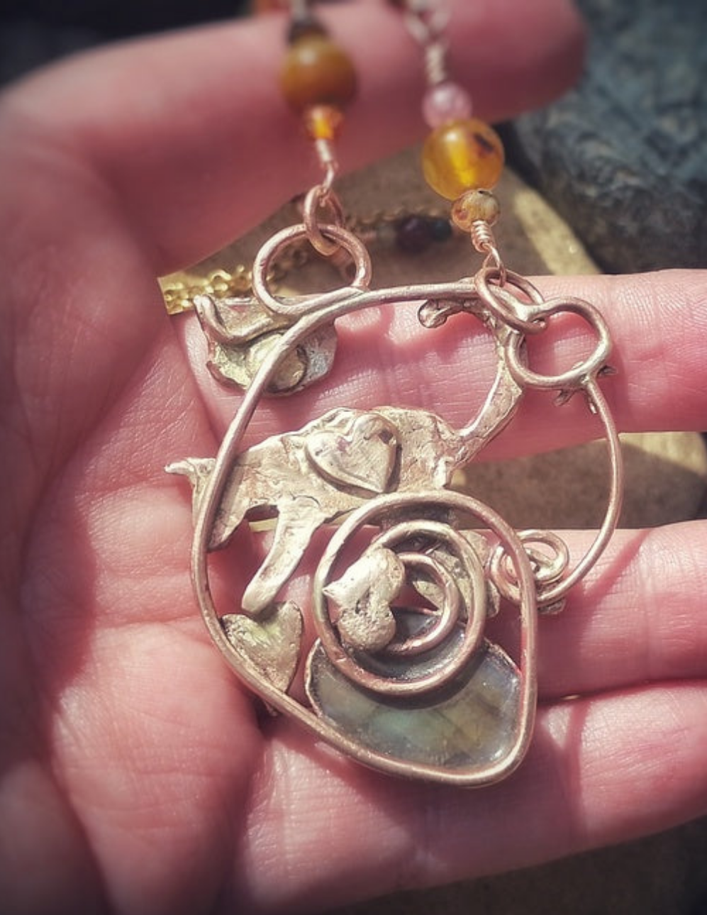 Materials: Genuine bronze pendant and findings with a stunning hazel labradorite cabochon crystal cabochons, with crystals in the chain including, garnet, jade, quartz and Czech glass beads on a brass rollo chain and a handmade clasp for easy on and off with a logo signature tag attached.