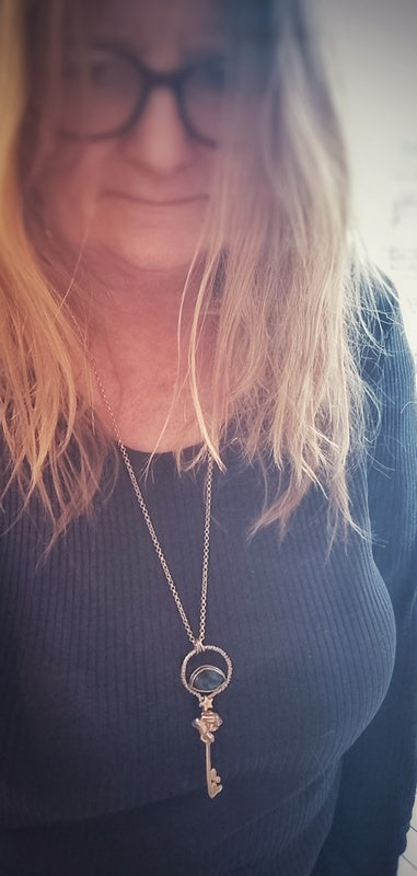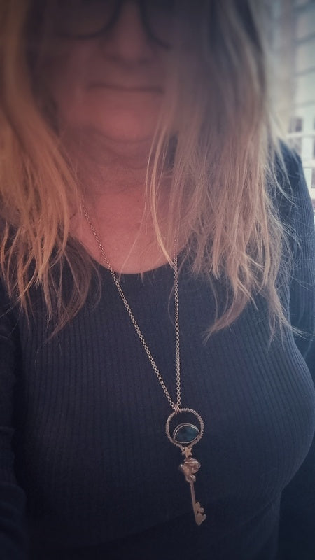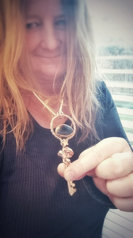 Materials: Genuine bronze hare key pendant with a labradorite cabochon eye piece and findings with a brass rollo chain and a handmade clasp for easy on and off with a logo signature tag attached.