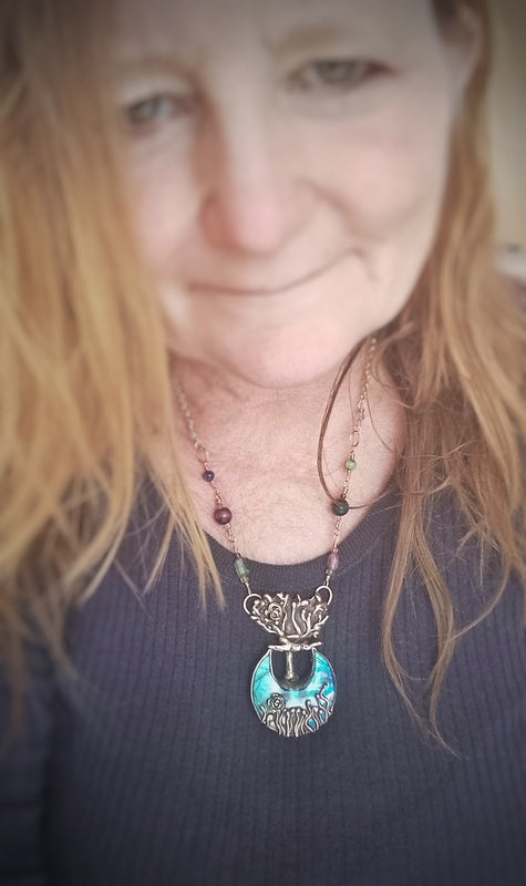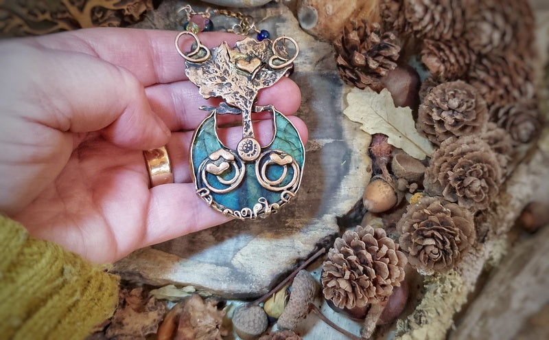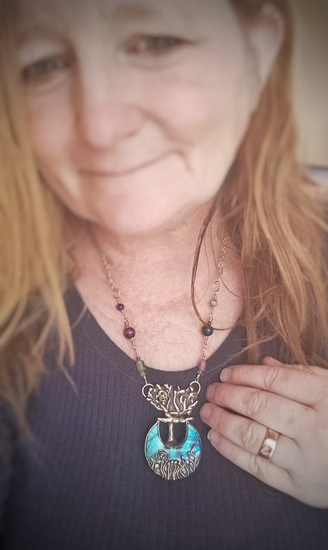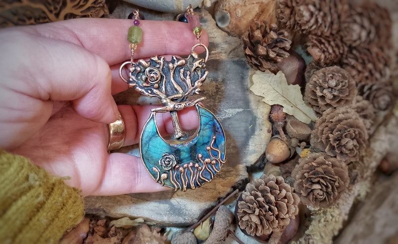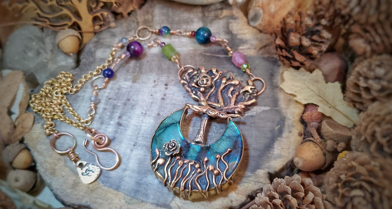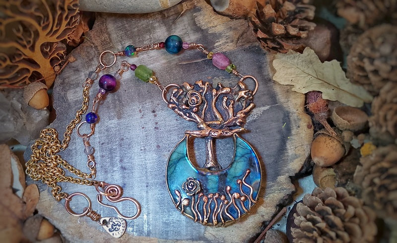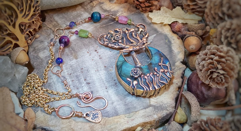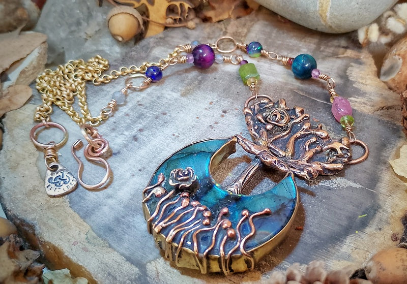 Materials: Genuine bronze pendant (the tentacles are secured delicately unseen with resin so they do not get caught and open up) and findings with a stunning labradorite moon cabochon crystal cabochon unusually set with a mini grassland set in a bed of AAA Opal Dust in polished resin at the base of the tree, with a combination of tourmalines, black Ethiopian opals, labradorite and tigers eyes, with a brass rollo chain and a handmade clasp for easy on and off with a logo signature tag attached.