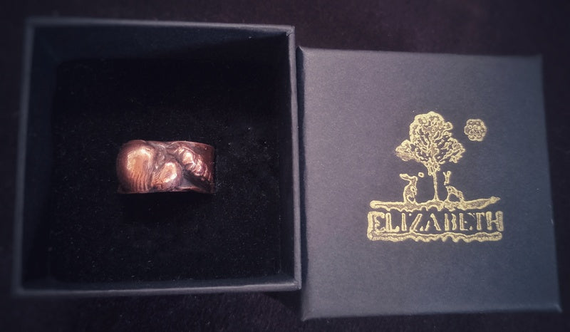 This piece is individually handmade and designed by me, Elizabeth, to a very high standard and has a very organic and unique feel to it ie. there will be some slight imperfections which add to its charm. If you are looking for a ‘factory finish’ then my jewellery is not for you. Each piece has an organic and wonderfully tactile feel with character lines and indentations within the design and creation and are wonderful to turn in your hand and wear.