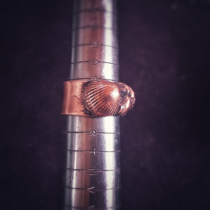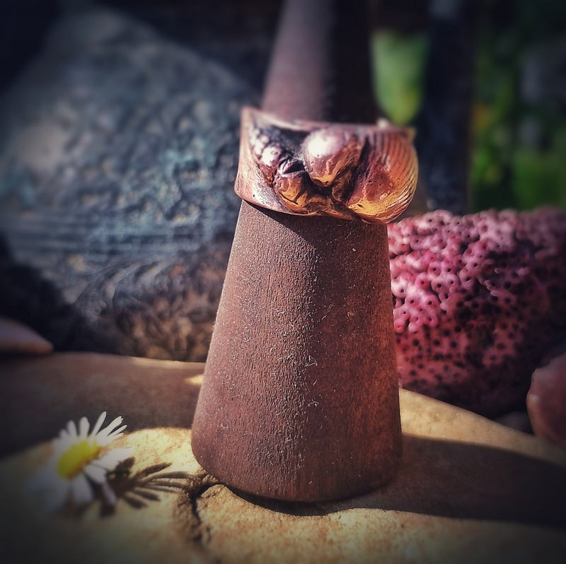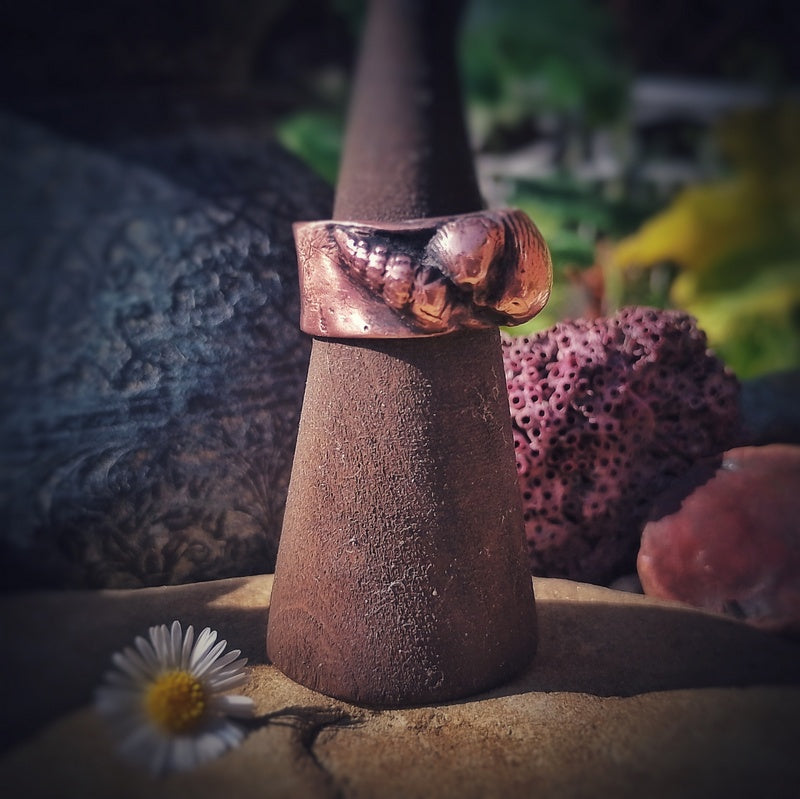 A selection of sea shells I've collected over the years from the Jurassic Coast from Charmouth and Lyme Regis in copper set on this copper wide band ring.