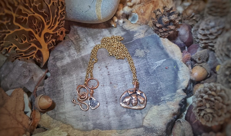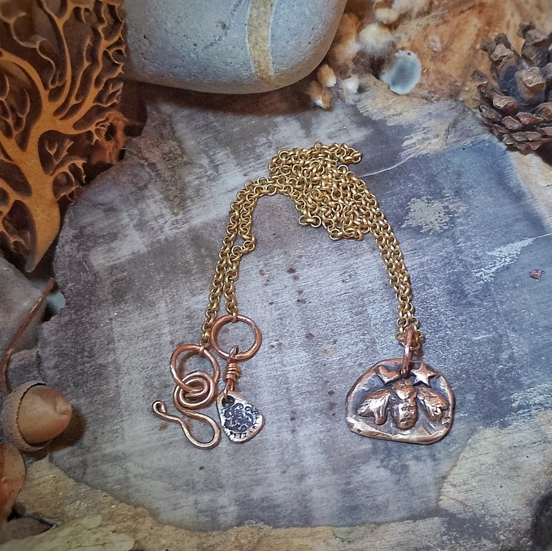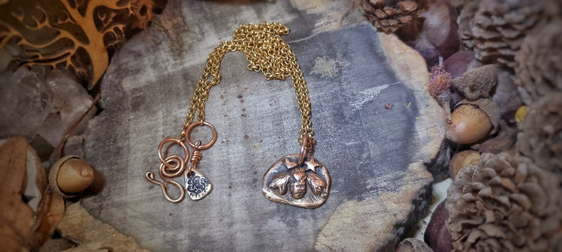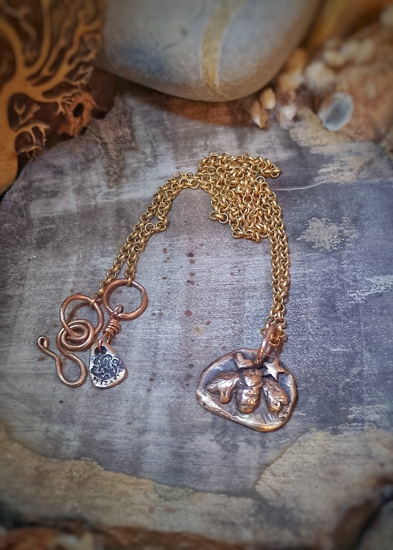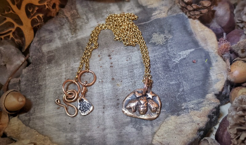 Materials: Genuine bronze pendant and findings on a brass rollo chain and a handmade clasp for easy on and off with a logo signature tag attached.
