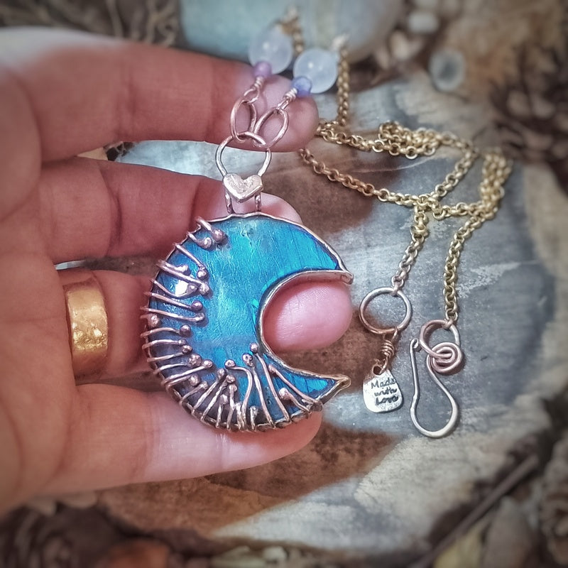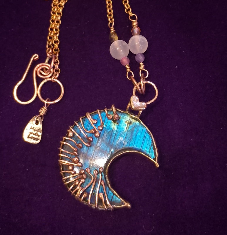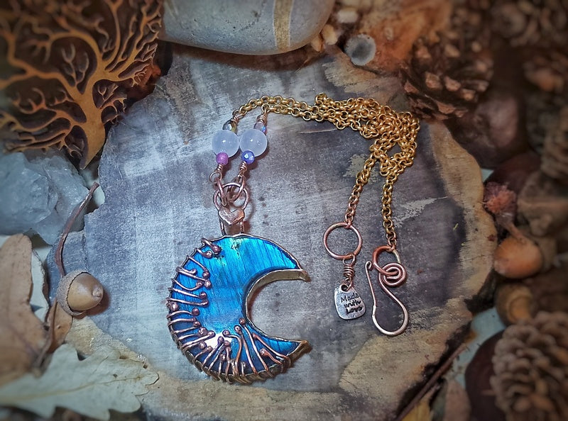 Materials: Stunning Labradorite Moon and genuine bronze handmade additions/decorations and findings, with a collection of crystals including selenite, a mini labradorite and Czech Glass beads on a brass rollo chain and a handmade clasp for easy on and off with a logo signature tag attached.