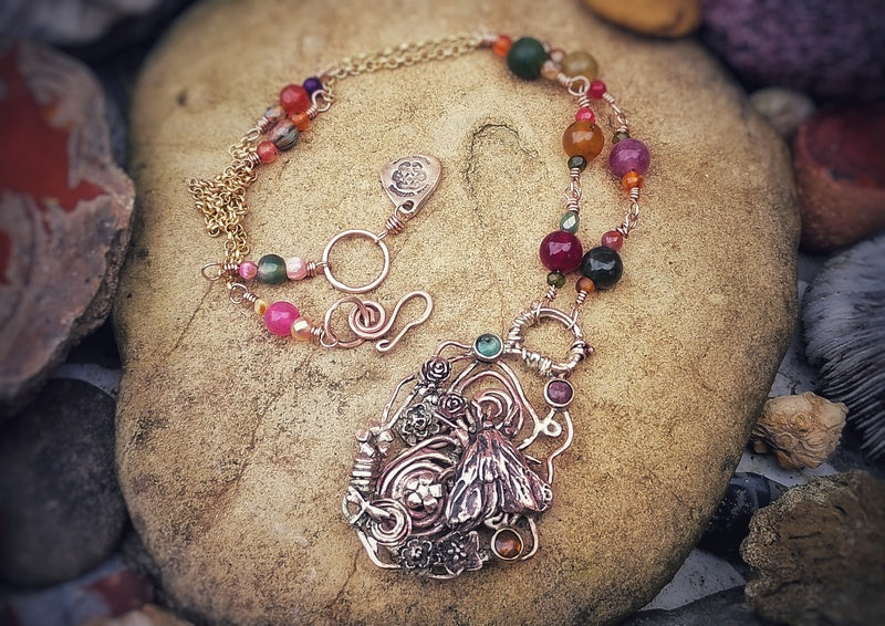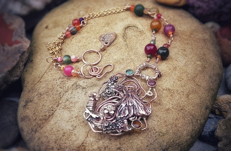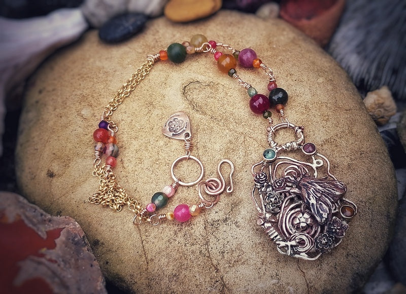 Materials: Genuine bronze with tourmaline cabochons and various crystals such as amethyst, amber, garnet, jade, quartz, sea glass and Czech beads on a rollo bronze chain and a handmade clasp for easy on and off with a logo signature tag attached.