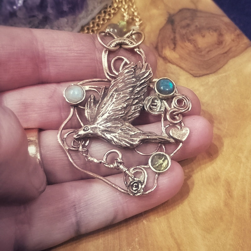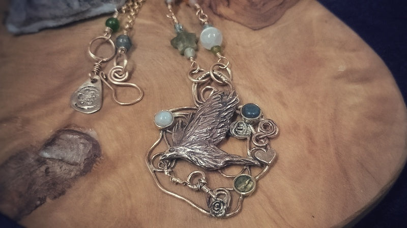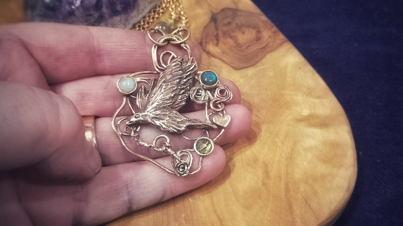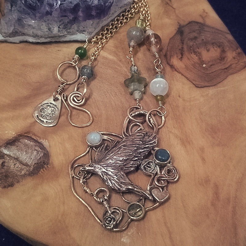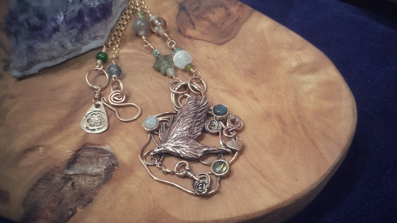 Material: Genuine Bronze raven mini rose key pendant and findings, with moonstone, labradorite and peridot cabochons and knotted crystals handmade chain with a Vessonite Garnet star bead, selenite crystal bead with a selection of peridot, teal and Czech beads to name a few, with and handmade fastener on the front to add to the style, easy on and off, and a signature logo attached at the back.