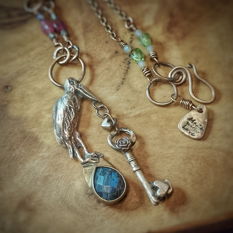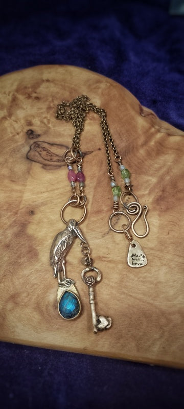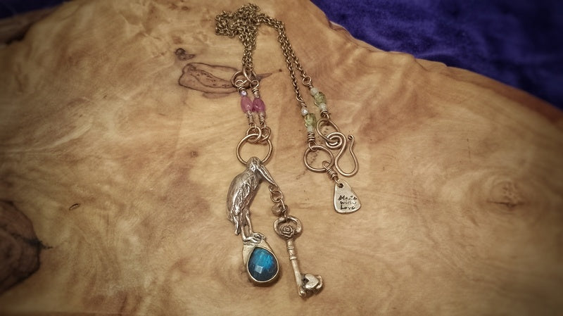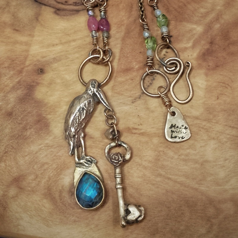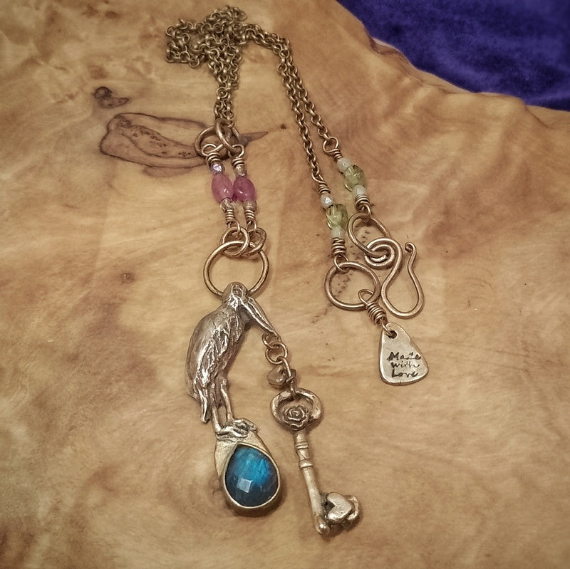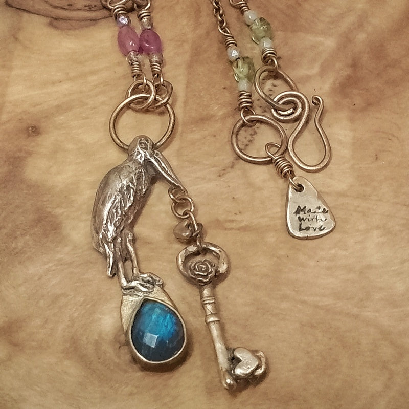 A beautiful and unusual pelican necklace, This pelican will help assist you in your new beginnings, offering safe travels whilst also showing you the way with the key through the door to the next chapter of your life.