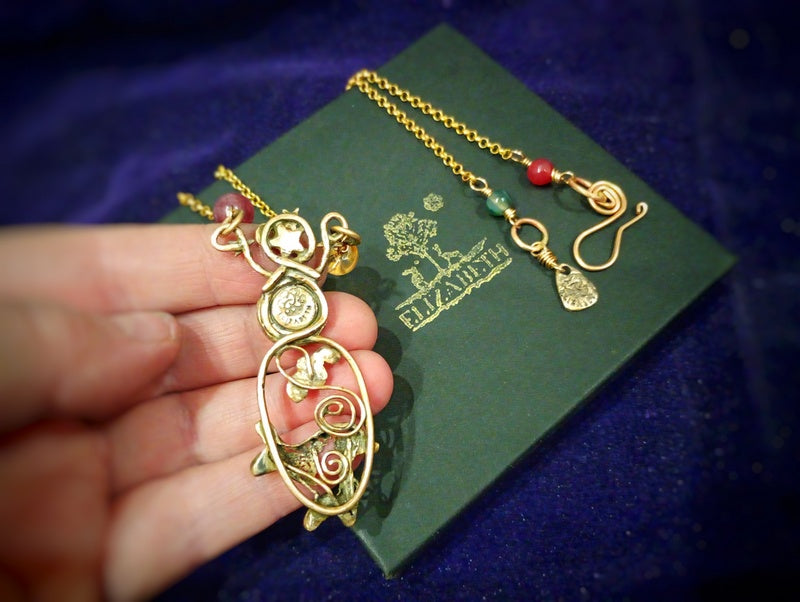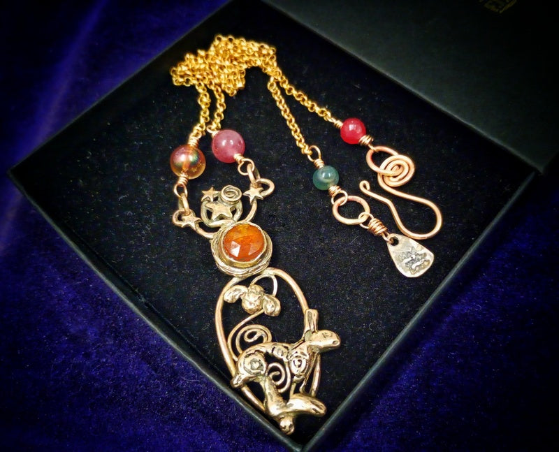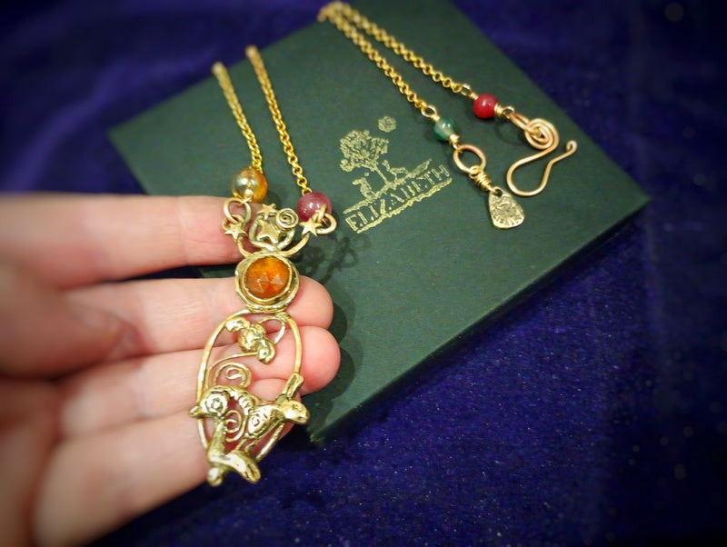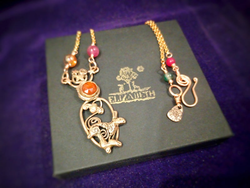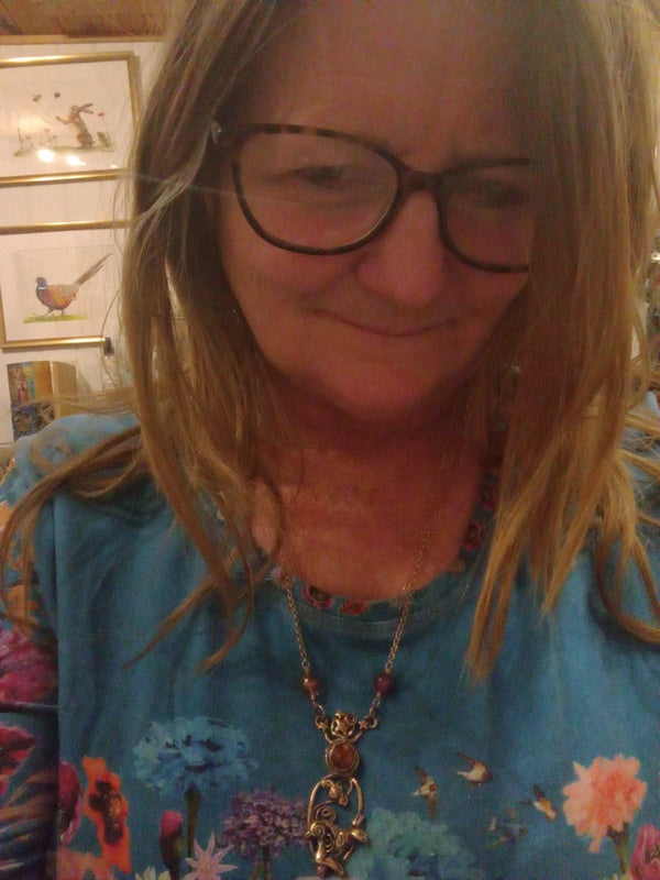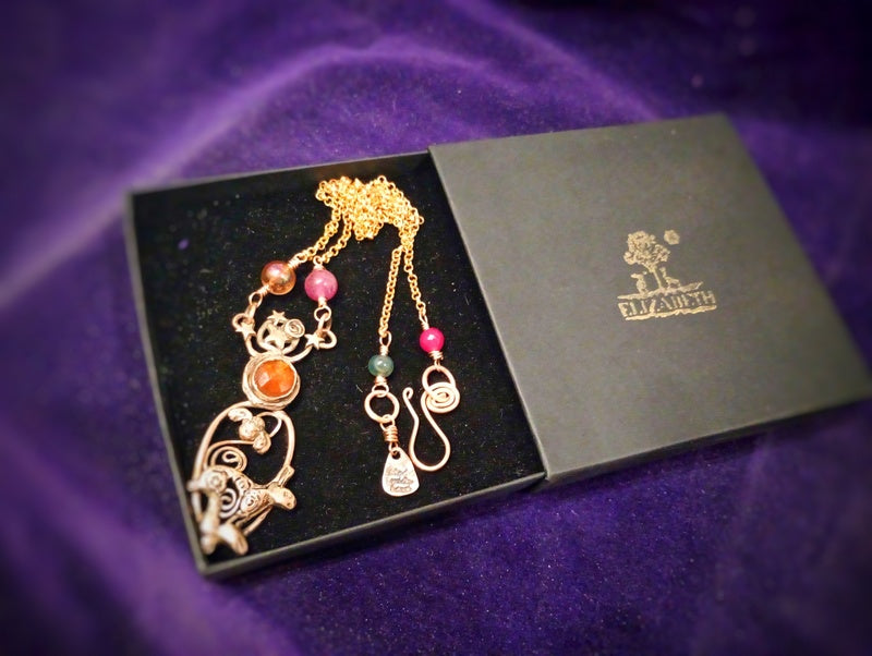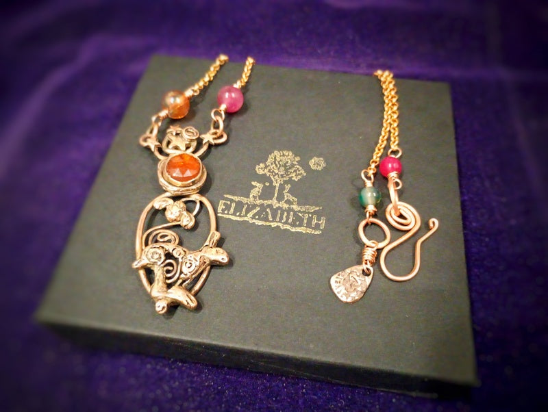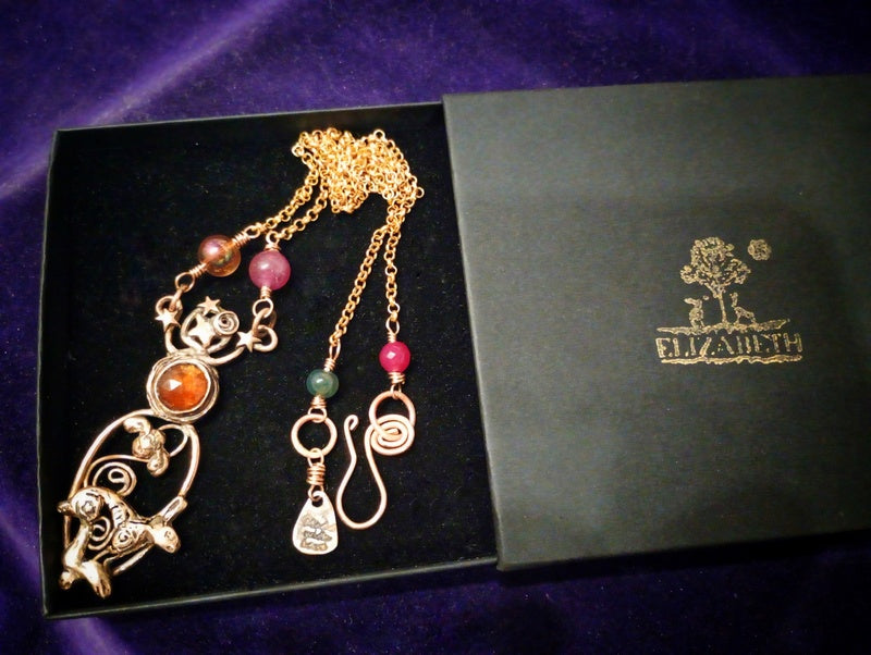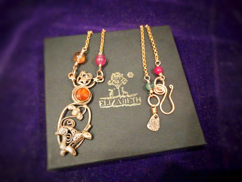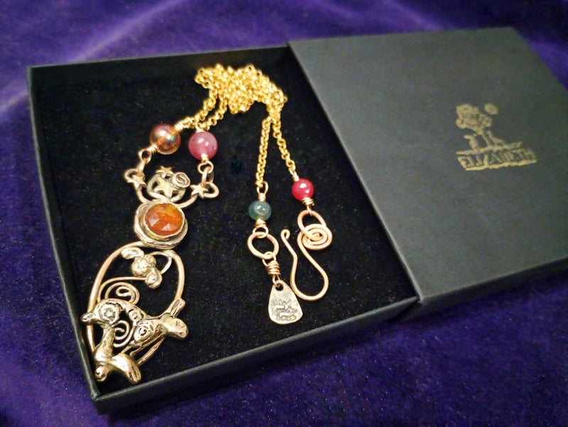 "I received my Amber Hare necklace today. It arrived in a lovely box which was well parcelled and protected. Along with the jewellery, there was included a lovely bookmark and delightful postcard. Elizabeth kept me updated on delivery status and item arrived quickly. The pendant is a masterpiece of intricate detail. The spiral to the back of the hare shows between the ears, another spiral is on the clasp. The addition of the beads, including amber adds to it's charm. It's quite a meaningful piece and I look forward to wearing it when outside.The shop is filled with pieces I'd like to have and feel drawn to, but most of all, I was drawn to this Amber Hare. There's a tree in the hare shape, and more I'm so glad I took the plunge and made it mine.Ordering was easy and Elizabeth was attentive throughout the whole buying experience. I am very happy and shall certainly return."