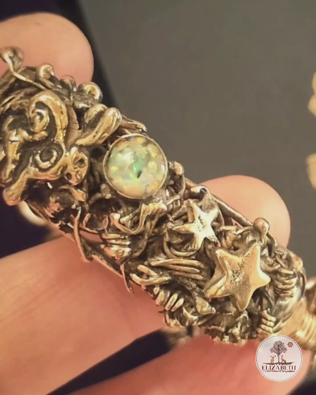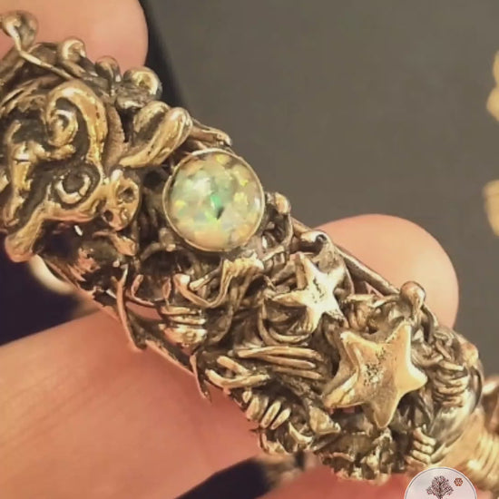 Material: designed and hand sculpted bronze hare and stars, hearts, flowers, birds nest with silver egg, with a beautiful AAA Opal Dust in polished resin moon. Genuine bronze lead and nickel free.