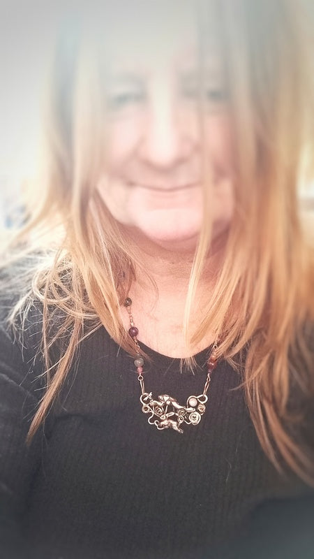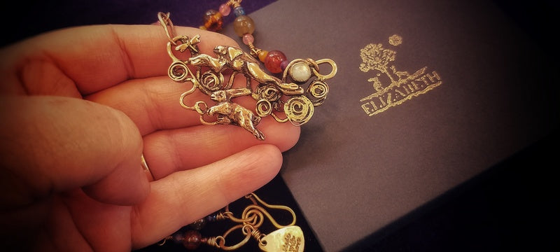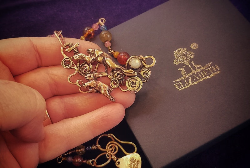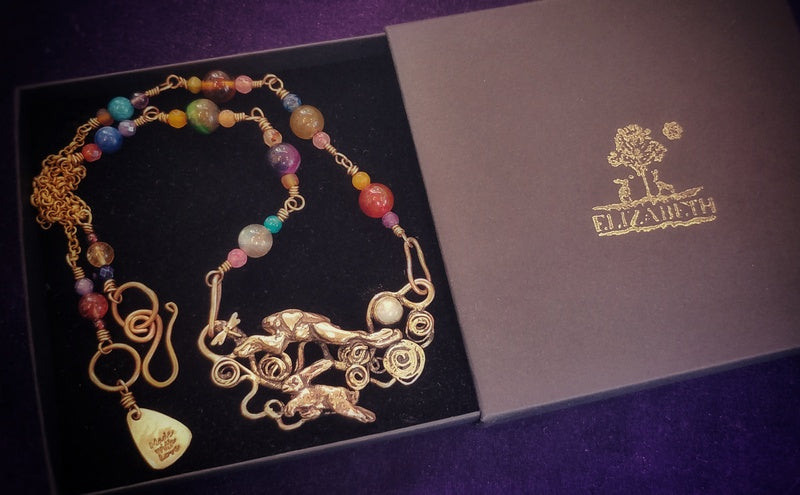 "I received my Amber Hare necklace today. It arrived in a lovely box which was well parcelled and protected. Along with the jewellery, there was included a lovely bookmark and delightful postcard. Elizabeth kept me updated on delivery status and item arrived quickly. The pendant is a masterpiece of intricate detail. The spiral to the back of the hare shows between the ears, another spiral is on the clasp. The addition of the beads, including amber adds to it's charm. It's quite a meaningful piece and I look forward to wearing it when outside.The shop is filled with pieces I'd like to have and feel drawn to, but most of all, I was drawn to this Amber Hare. There's a tree in the hare shape, and more I'm so glad I took the plunge and made it mine.Ordering was easy and Elizabeth was attentive throughout the whole buying experience. I am very happy and shall certainly return."