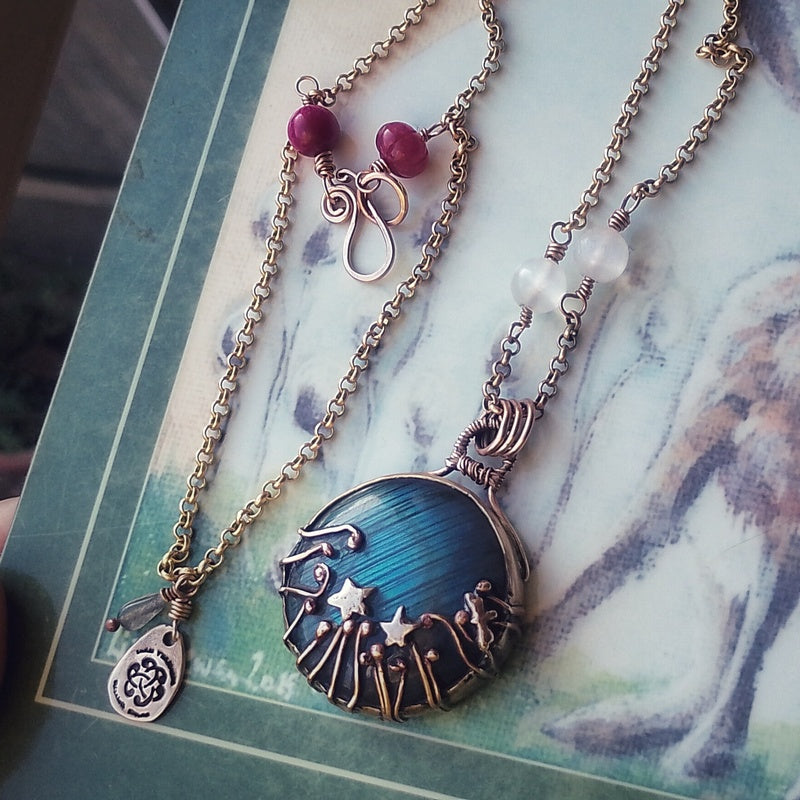 Materials: Genuine bronze pendant (the tentacles are secured delicately unseen with resin so they do not get caught and open up) and findings with a stunning labradorite cabochon crystal cabochon unusually set, with two selenite crystals in the chain and pink tigers eye and a Ruby hand carved melon, on an adjustable brass rollo chain and a handmade clasp for easy on and off with a logo signature tag attached.
